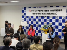 「深田茉莉選手 金メダル獲得報告会 および 特別市民栄光賞贈呈式」が3月3日、みよし市役所で行われた。