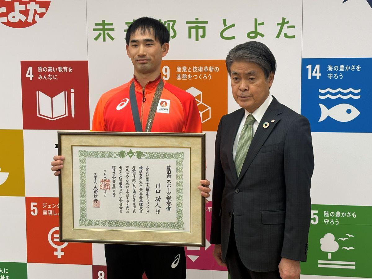 「豊田市わがまちアスリート」で、東京2025デフリンピックで銅メダルを獲得した川口功人選手に1月23日、「豊田市スポーツ栄誉賞」が授与された。